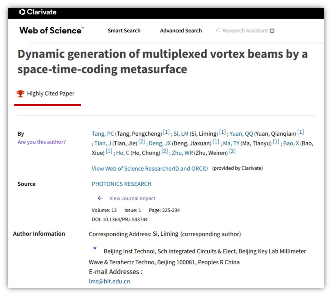 近日,根据Web of Science中Essential Science Indicators(ESI)的数据显示,司黎明教授课题组在《Photonics Research》上发表的论文“Dynamic Generation of Multiplexed Vortex Beams by a Space-Time-Coding Metasurface”入选ESI高被引论文(Highly Cited Paper)。论文第一完成单位为北京理工大学,第一作者为博士研究生汤鹏程,通讯作者为司黎明教授,上海交通大学朱卫仁副教授、贺冲副教授等做出了重要贡献。