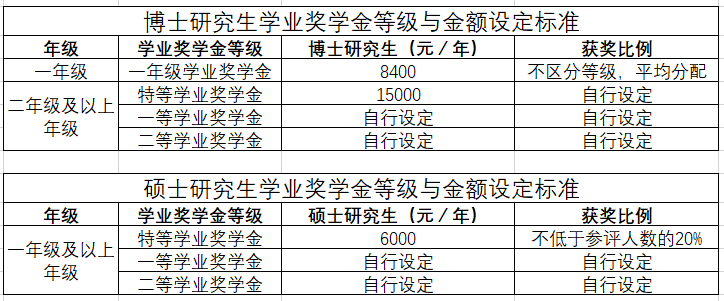 1.博士研究生奖励标准:学校根据核定人数,按每年人均不低于8400元下发各单位分配额度,各年级奖励等级与标准由学院制定。原则上分三个等级,并设定金额级差。其中,一年级博士研究生学业奖学金不分等级,三年级及以上博士研究生须设立特等奖学金,奖励金额不低于每生每年15000元,奖励比例不低于参评人数的10%。